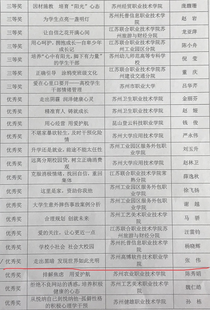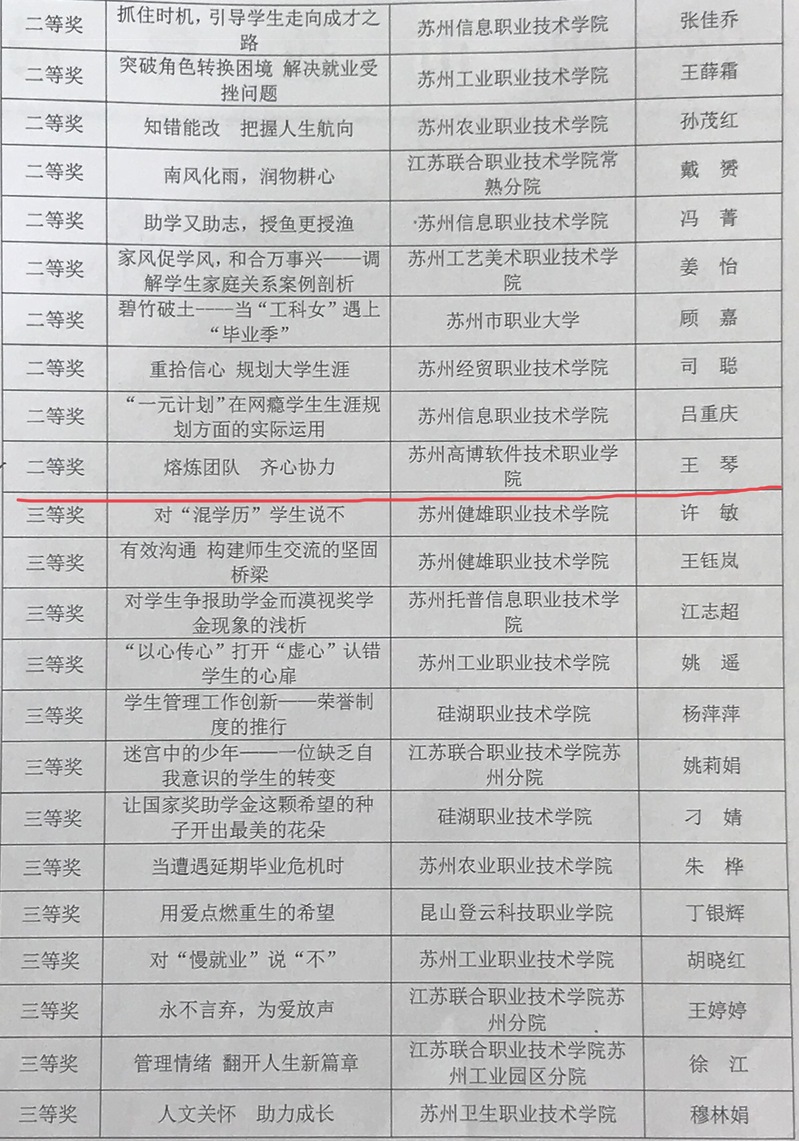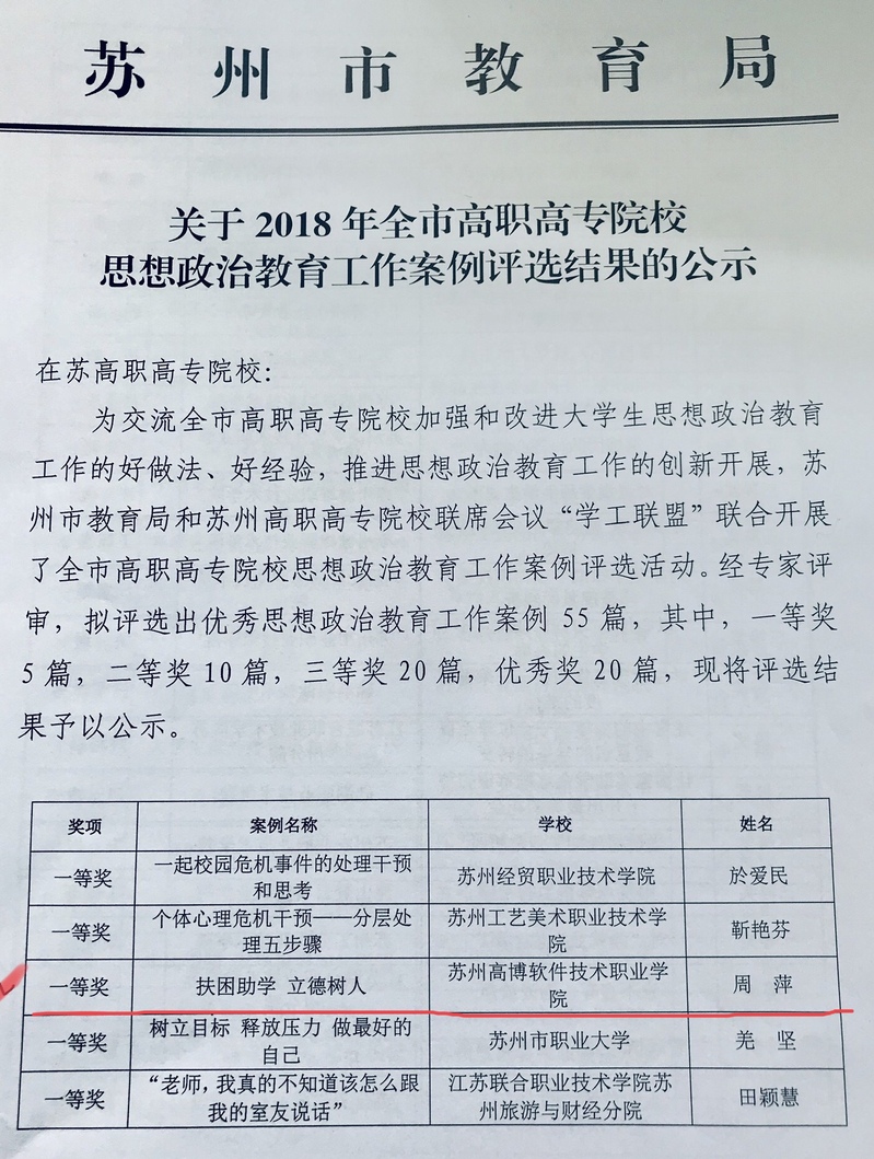 由苏州市教育局和苏州高职高专院校联席会议“学工联盟”联合开展的全市高职高专院校思想政治教育工作案例评选活动中,经专家组评审,最终选出一等奖案例5篇,二等奖案例10篇,三等奖案例20篇,优秀奖案例20篇。其中,我院学生处学生资助管理中心主任周萍老师的《扶困助学 立德树人》荣获一等奖;学生处学生健康教育中心主任王琴老师的《熔炼团队 齐心协力》荣获二等奖;国际商学院辅导员张伟老师的《走出黑暗 发现世界如此光明》荣获优秀奖。