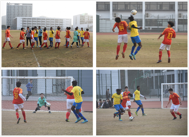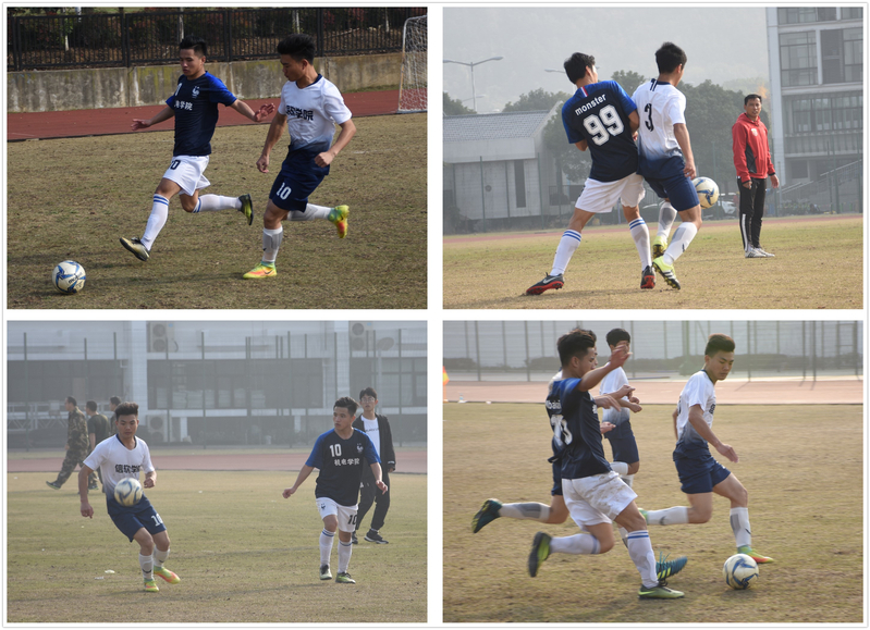 比赛开始前,两队分别围在一起鼓劲,希望自己的队伍取得好成绩。在比赛的前15分钟两队的比分始终为0比0,场上的气氛格外的令人紧张,让人目不转睛的盯着,生怕漏了哪一分一秒,哪个队伍就率先得分。在场上双方队员的焦灼的心情中,国际学院代表队终于在比赛上半场得到了第一分。中场休息时间,啦啦队的同学们纷纷围上去为自己的球员鼓劲,递水,递毛巾等,希望他们在接下来的比赛中取得更好的成绩。下半场比赛两队都替换了球员上场,在此之前已经养精蓄锐的球员们都使出了自己的浑身解数,在45分钟的时候国际学院代表队又进了一球比分一下子拉开来了。此时人文学院代表队开始紧张了起来。边上的同学们再次为两队的球员加油,助威。时间就这样一点点的过去,最终,国际学院代表队以3:0战胜人文社会科学学院代表队。在决赛前进行的第三、四名争夺战中,机电工程学院代表以3:1的比分战胜信息与软件学院代表队。比赛结束后,不同队伍的队员们相互拥抱,享受着比赛的带来的喜悦与成长。