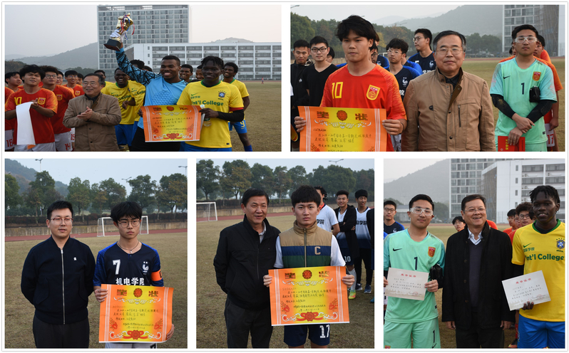 本次足球联赛历时一个月,比赛过程中,运动员顽强拼搏、奋勇争先,充分体现了同学们追求更高、更快、更强的体育精神,彰显了团结协作、互帮互助的道德风尚。裁判员公正执裁,体现了公平精神。所有场次的比赛既紧张激烈又和谐文明,赛出了风格、赛出了水平。最后国际学院代表队荣获冠军、人文社会科学学院代表队荣获亚军、机电工程学院代表队荣获季军及信息与软学院代表队荣获体育道德风尚奖,在场领导分别为各获奖队伍、个人颁发了奖状、奖杯并合影留念。