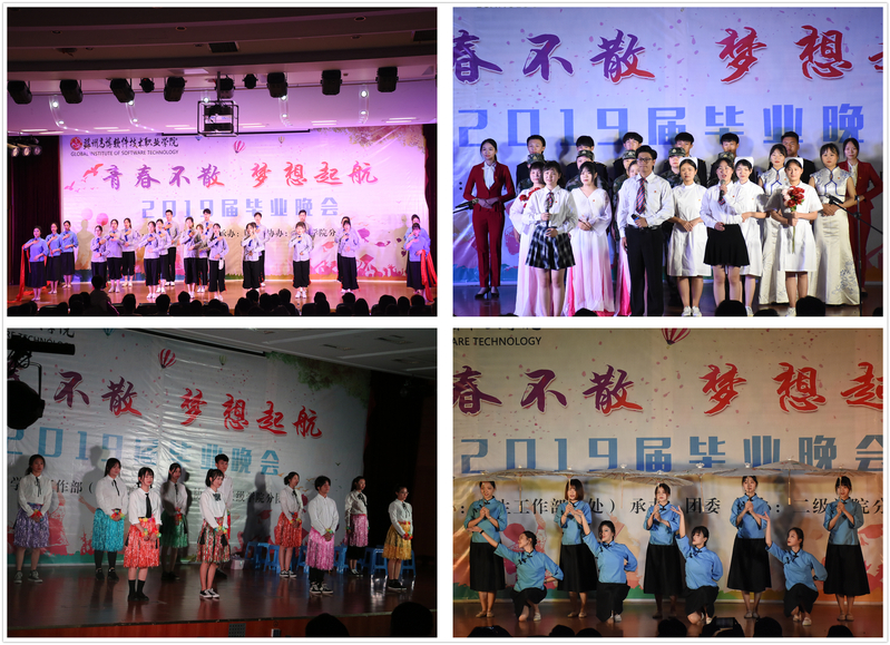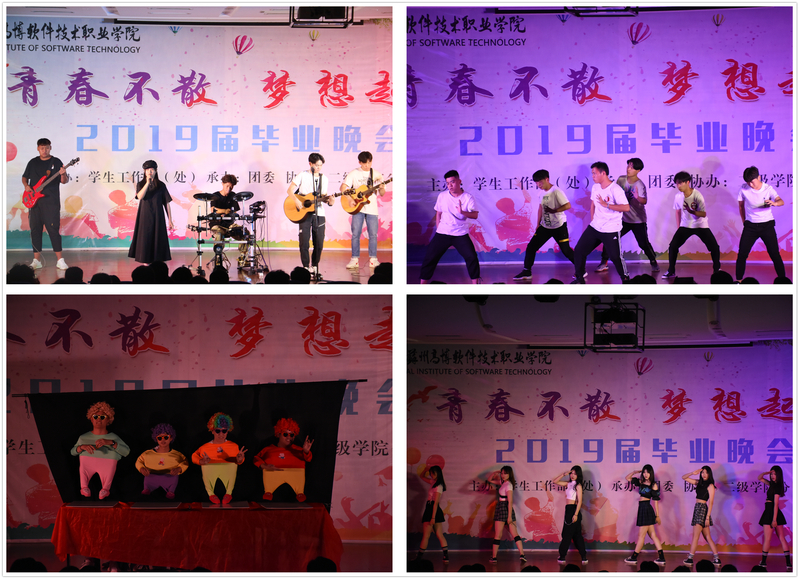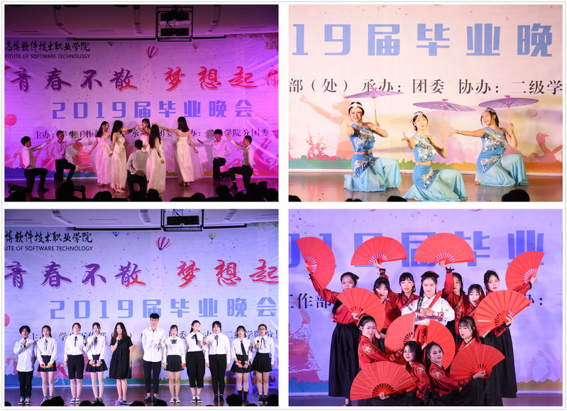 晚会在乐队表演《后来》、《平凡之路》之后,正式拉开帷幕。艺术与建筑学院带来的舞蹈《爱的华尔兹》,把热情沉浸在爱的华尔兹里,踮起脚尖,舞出美丽的姿态,展现爱的温柔;校艺术团带来的傣族舞《傣家的女儿傣家的雨》,舞姿像水一样灵动,似涓涓的细流,温柔而细腻,又像大江的洪流,迅涌而澎拜;国际商学院带来的情景剧《最后一课》,则展现三年大学生活忙碌而闲适,学习紧张而刺激,友情诚挚而纯洁,让观众们沉浸在对青春的怀念之中;校艺术团带来的扇子舞《沧海一声笑》,屹立于苍穹之下,青丝随风飘扬,扇声朗朗,仿佛在诉说着对时间的惆怅和对未来的畅想;机电工程学院带来的小人舞《祝你一路顺风》,以独特的方式向毕业的学姐学长们送上衷心的祝福;校艺术团和国际商学院带来的舞蹈《阳光女孩》,混合着时代的气息,绽放青春的魅力;信息与软件学院带来的流行舞《麋鹿》,展现阳光男孩刚健有力、热情奔放的风貌;校艺术团带来的伞舞《送别》,走进一场情真意切的别离中,诉说天下无不散之筵席,聚时欢喜,散时悲伤。校学生会、医学与公共服务学院、机电工程学院和人文社会科学学院带来的诗朗诵《奋斗青春》,表达了毕业生们即将奔赴全国各地奉献自己的青春,实现人生理想;晚会在校红十字会和校艺术团带来的手语表演《我爱你,中国》中落下帷幕。最后,主持人宣布晚会结束,毕业生们纷纷上台合影留念,互诉离情,久久不愿散去。