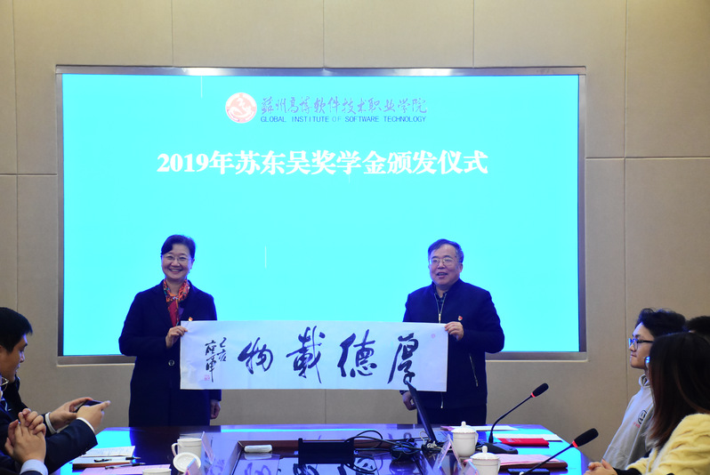随后,徐子良教授总结讲话,他代表学校向苏州东吴物业管理有限公司热心奉献、捐资助学的善举表达由衷的感谢和崇高敬意,并希望获奖同学要做一个胸怀大志、有坚定信念的人,一个道德高尚、充满浩然正气的人,一个心怀感恩、具有表率作用的人。最后,徐子良教授向陈爱萍教授赠送书法作品《厚德载物》并合影留念。