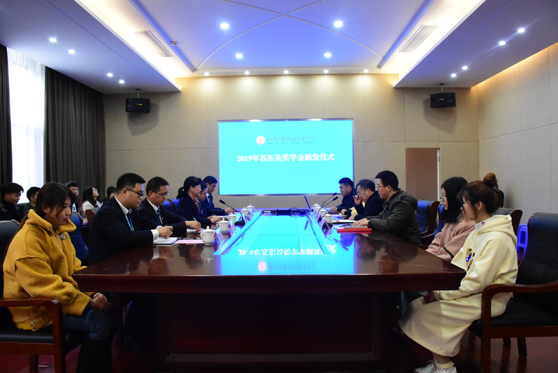11月28日下午15:00,学校2019年苏东吴奖学金颁发仪式在行政楼会议室举行。学校党委副书记、副校长徐子良教授,苏大教服集团党委书记陈爱萍教授,苏大教服集团CCO、东吴物业副总经理毛波杰教授,学生处处长邹艳星副教授,学生处副处长、就业指导中心主任、资助管理中心主任周萍老师等相关领导和15名奖学金获得者代表共同参加仪式,仪式由学生处副处长、校团委书记胡赛老师主持。