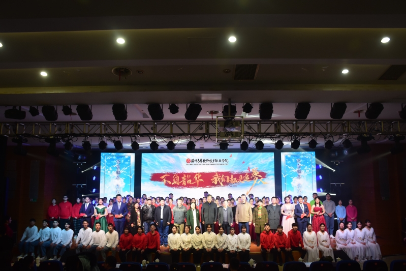 12月25日晚18:30,学校“不负韶华 我们都是追梦人”2020年迎新晚会在报告厅举行。陈家颐副校长、倪筱琴副校长、徐子良副校长,党政办王绍福主任,学生处邹艳星处长,图书馆钦春英馆长,工会主席孙娴,信息与软件学院孙涌院长,机电工程学院廖振强院长,艺术与建筑学院徐雷院长,医学与公共服务学院孙小娅院长,国际学院卢宁院长及学校各单位的领导、老师与600多名学生代表共同观看了本场晚会。