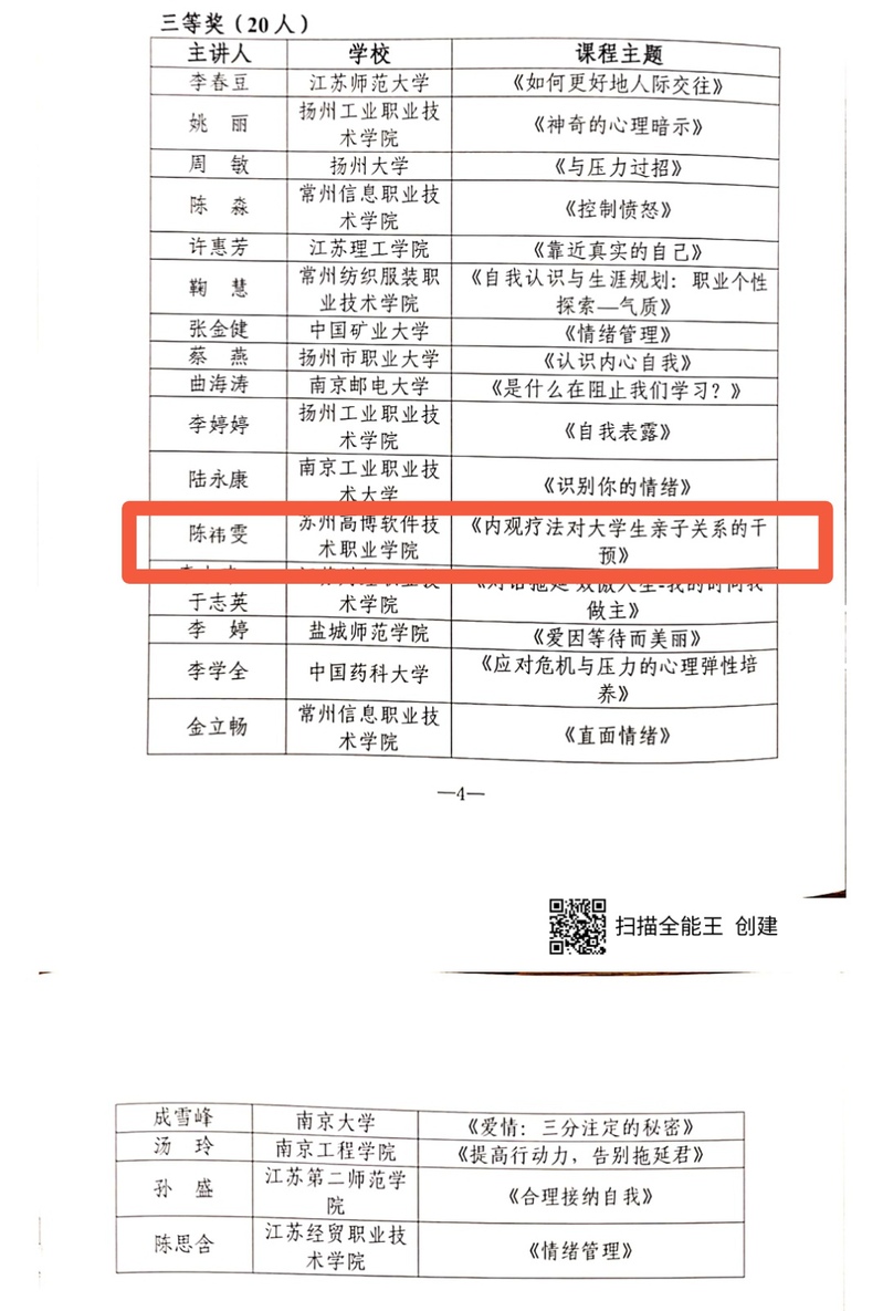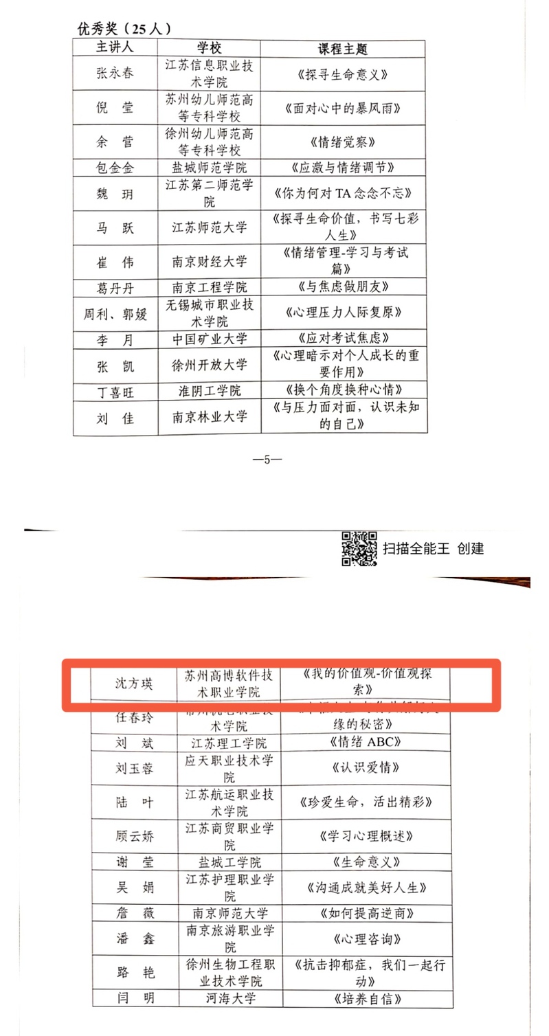 在刚接到的《关于公布全省高校大学生心理健康教育“精彩一课”教学微课竞赛结果的通知》(苏心发[2021]5号)文件的表彰名单中,我校两位老师榜上有名,其中陈祎雯老师荣获三等奖、沈方瑛老师荣获优秀奖,这也是我校首次在该竞赛中获奖!